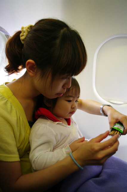 一上飛機坐定位就趕緊拿出餅乾讓她吃