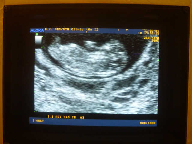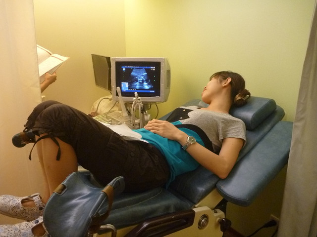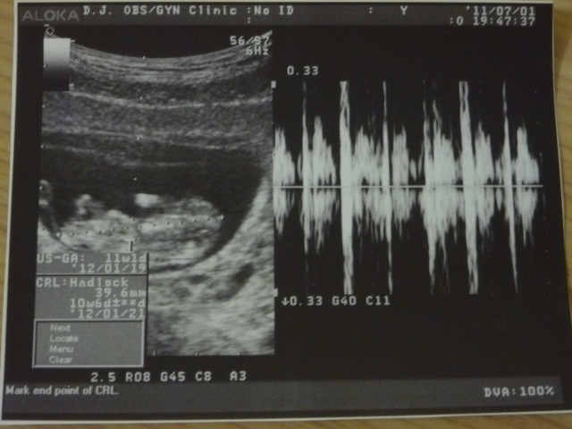 果然胎兒周圍還是有零星出血(胎兒下方零星一塊塊黑黑的就是出血的地方)