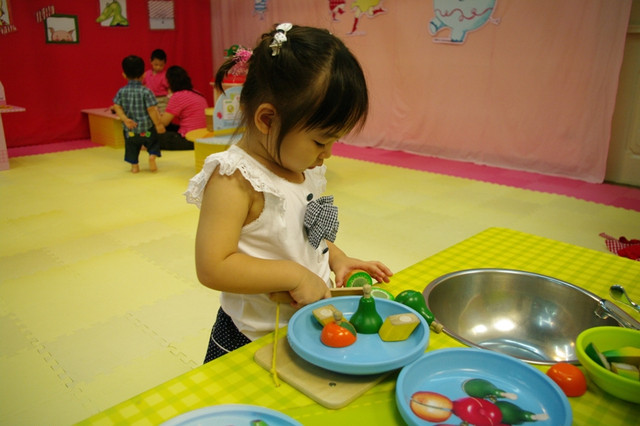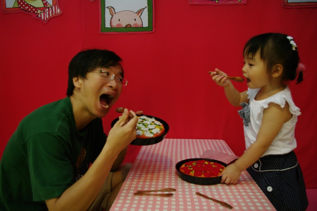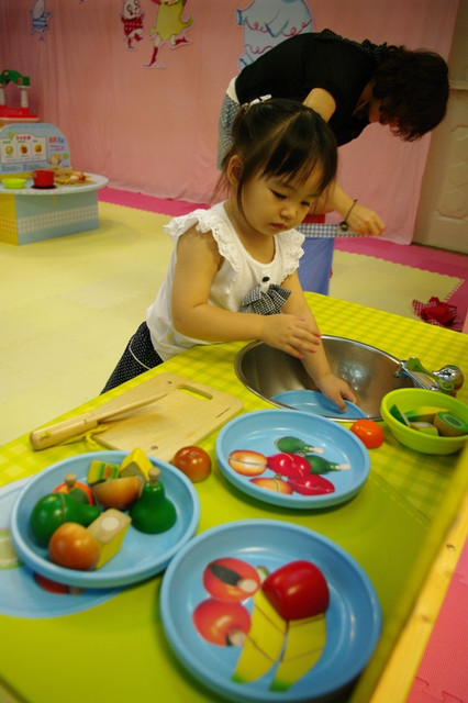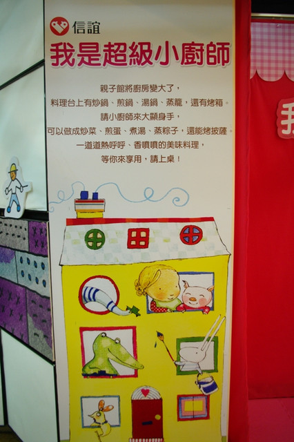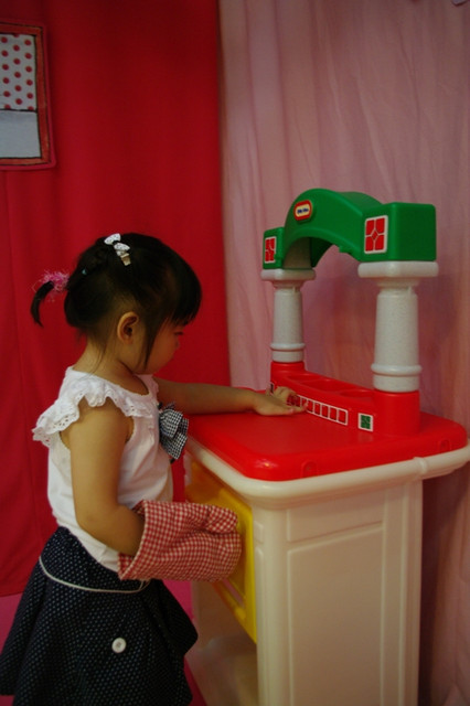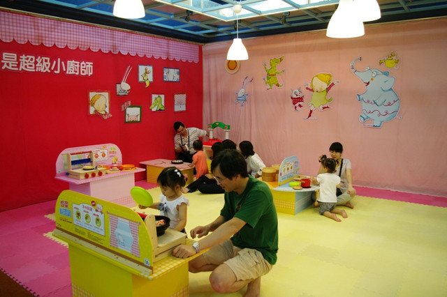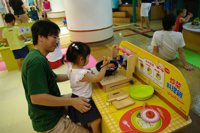 歡迎小朋友來親子館挑戰廚藝、大顯身手。料理台上有炒鍋、煎鍋、湯鍋、蒸籠,還有烤箱。可以做成炒菜、煎蛋、煮湯、蒸粽子,還能烤披薩。透過孩子獨特的料理創意,邀請您和孩子一起快樂上桌!到親子館扮演超級棒的小廚師喔!