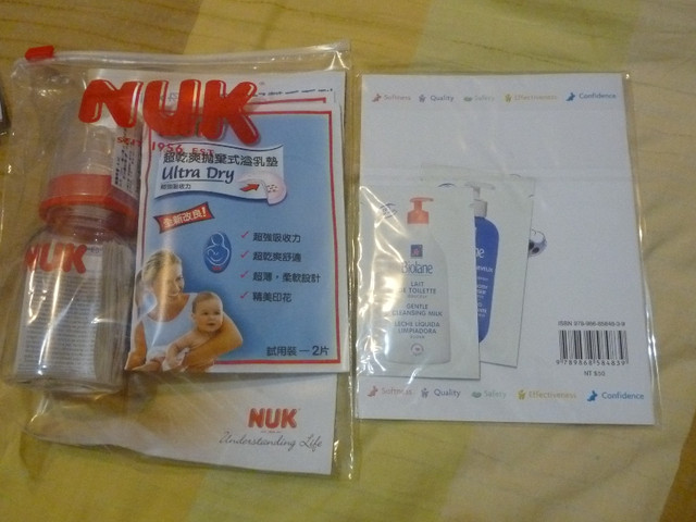 另外就是NUK溢乳墊試用品2片/包共兩包+NUK 125ml PC奶瓶1隻