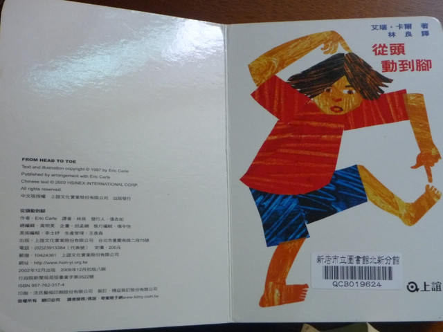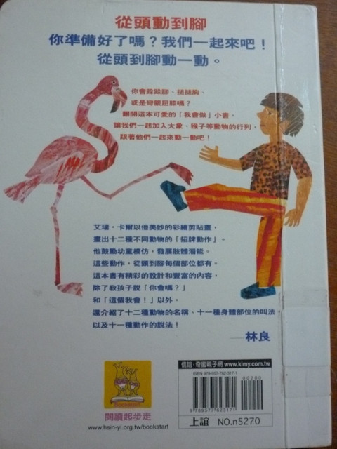 已經七十歲的色彩魔術師艾瑞卡爾,創作過《好餓的毛毛蟲》、《好忙的蜘蛛》與《好安靜的蟋蟀》等六十多本經典圖畫書,作品已被翻譯成二十七種語言,在全世界發行。精於剪貼畫的他,喜歡先將顏料塗滿畫紙,再剪、割出自己想表現的圖像,色彩只要一經過艾瑞卡爾的手,彷彿都像點石成金般具有魔力。《從頭動到腳》也不例外,書中白色的背景將每一隻動物的圖像襯托得更為鮮艷生動,賦予牠們鮮活的藝術造型。