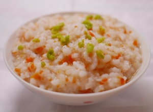 以大骨湯為湯底,將富麗米煮成五倍粥,米粒化開,加入馬鈴薯泥、紅蘿蔔、地瓜、豌豆泥,讓湯中充滿蔬菜和香菇的甜味,在加入黑豬肉肉泥、香菇泥,更是提升粥的香味,無論是顏色或香味都能讓小寶寶更喜愛