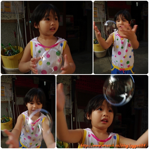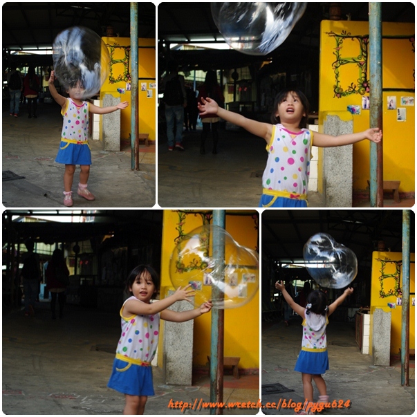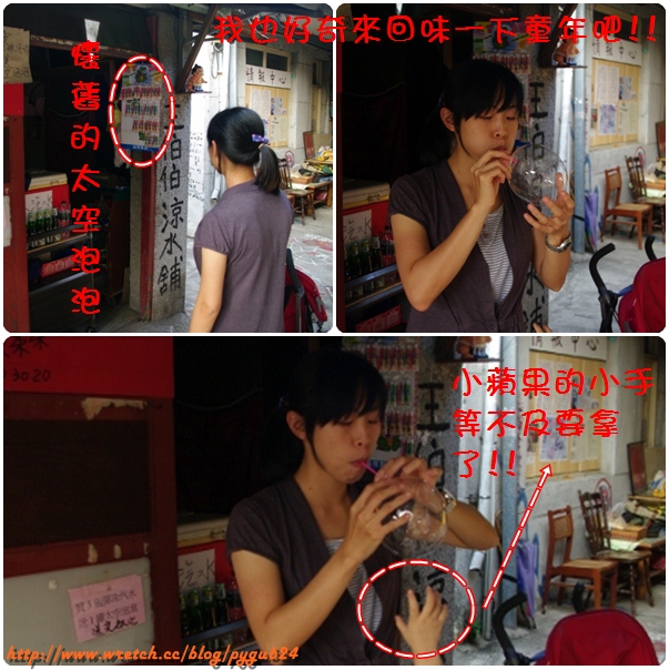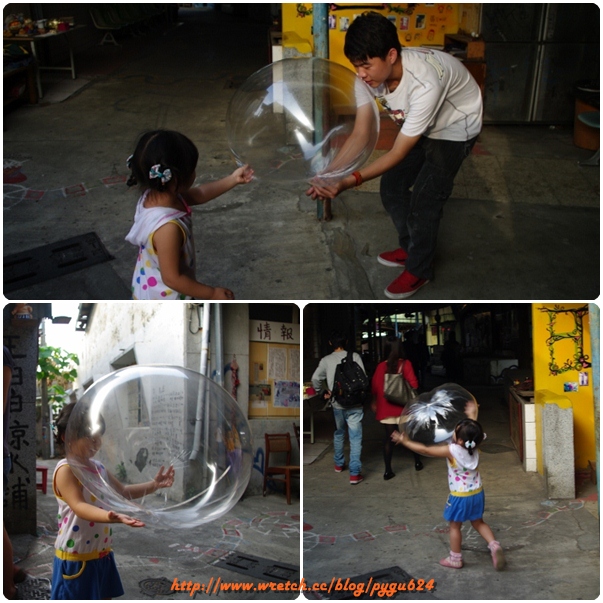 來到舊市集的巷弄中~~剛好有個年輕小哥給小蘋果一顆很大的太空泡泡~