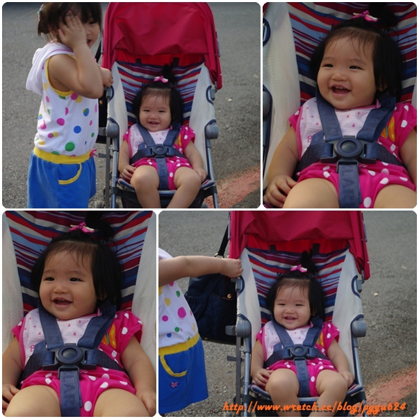 小貝果其實已經累到癱在推車上了~但還是輕易的一逗就笑!!
