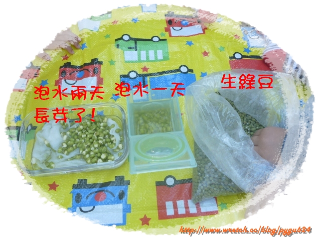 泡水一天的綠豆已經脹大很多~泡水兩天的綠豆還長芽囉!!