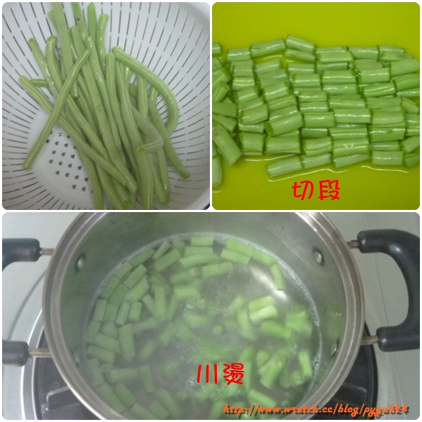 所以這次是把敏豆切小段燙熟燙軟給小貝果當手指食物吃~還蠻適合的!!