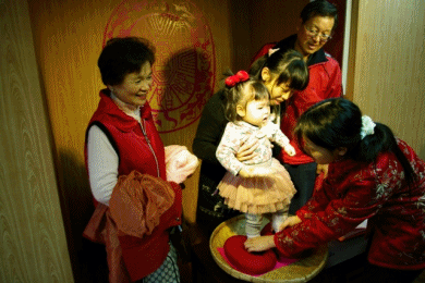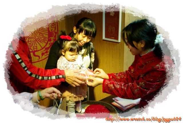 一般來說~腳踏龜儀式是在祭祖之後~讓寶寶光腳ㄚ踩在紅龜上"踩壽"!祝福寶寶長命百歲喔!