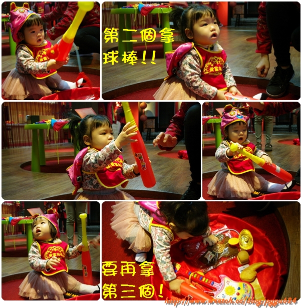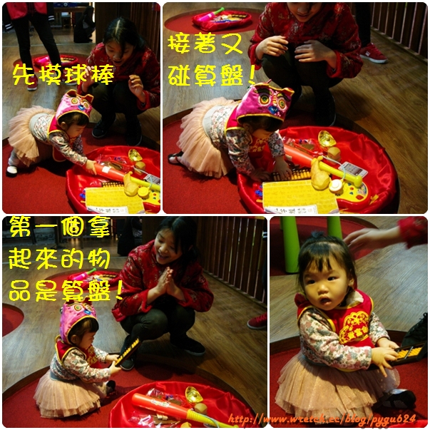抓周開始~小貝果一開始摸摸球棒~後來瞥到算盤~就直接把算盤(象徵經商、企業家)拿起來囉!!