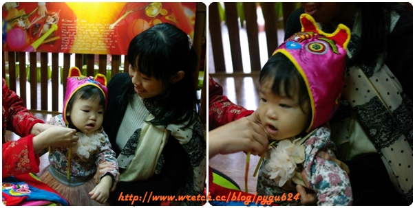 抓周儀式來囉!先幫寶寶戴上虎帽和穿上長命富貴大紅圍兜~
