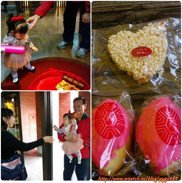 右圖就是今天抓周的紀念品~可愛的心型米香及像紅龜粿的檸檬蛋糕!
