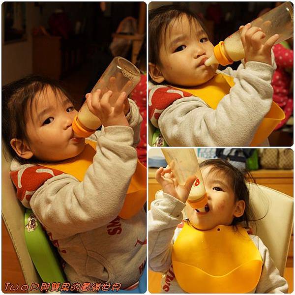 從來不用奶瓶的她~可能看保母家的伙伴都有用~她也好奇的吵著用奶瓶喝~
