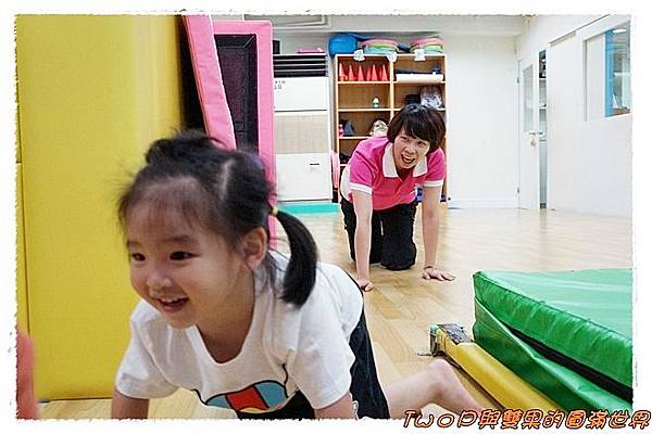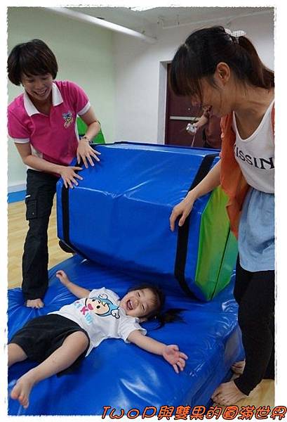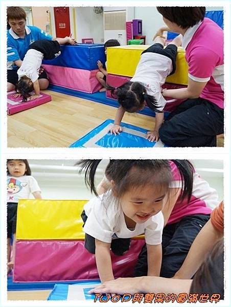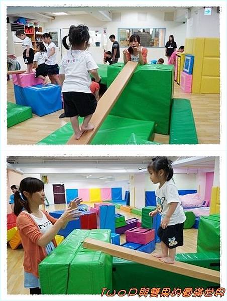 王老師與媽咪合作保護下~~小貝果在大積木上安全的翻滾~