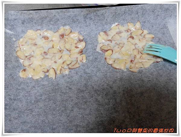 #烤盤鋪烘焙紙、取適量食材用叉子鋪平成薄片樣(克里斯汀說:叉子沾些許水可以防止沾黏)