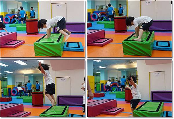在彈簧床上 小貝果往上跳後得用跪姿落地再反彈