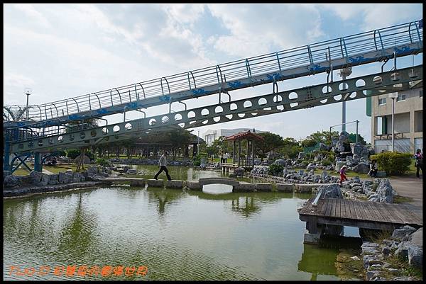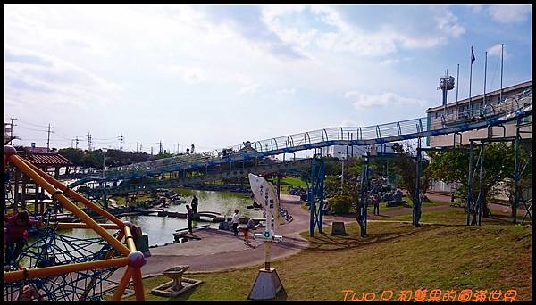 而這溜滑梯最妙的是橫跨一個人工池 標記的地方就是溜滑梯終點