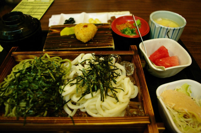 這是雙口味清爽涼麵蕎麥麵和烏龍麵的結合